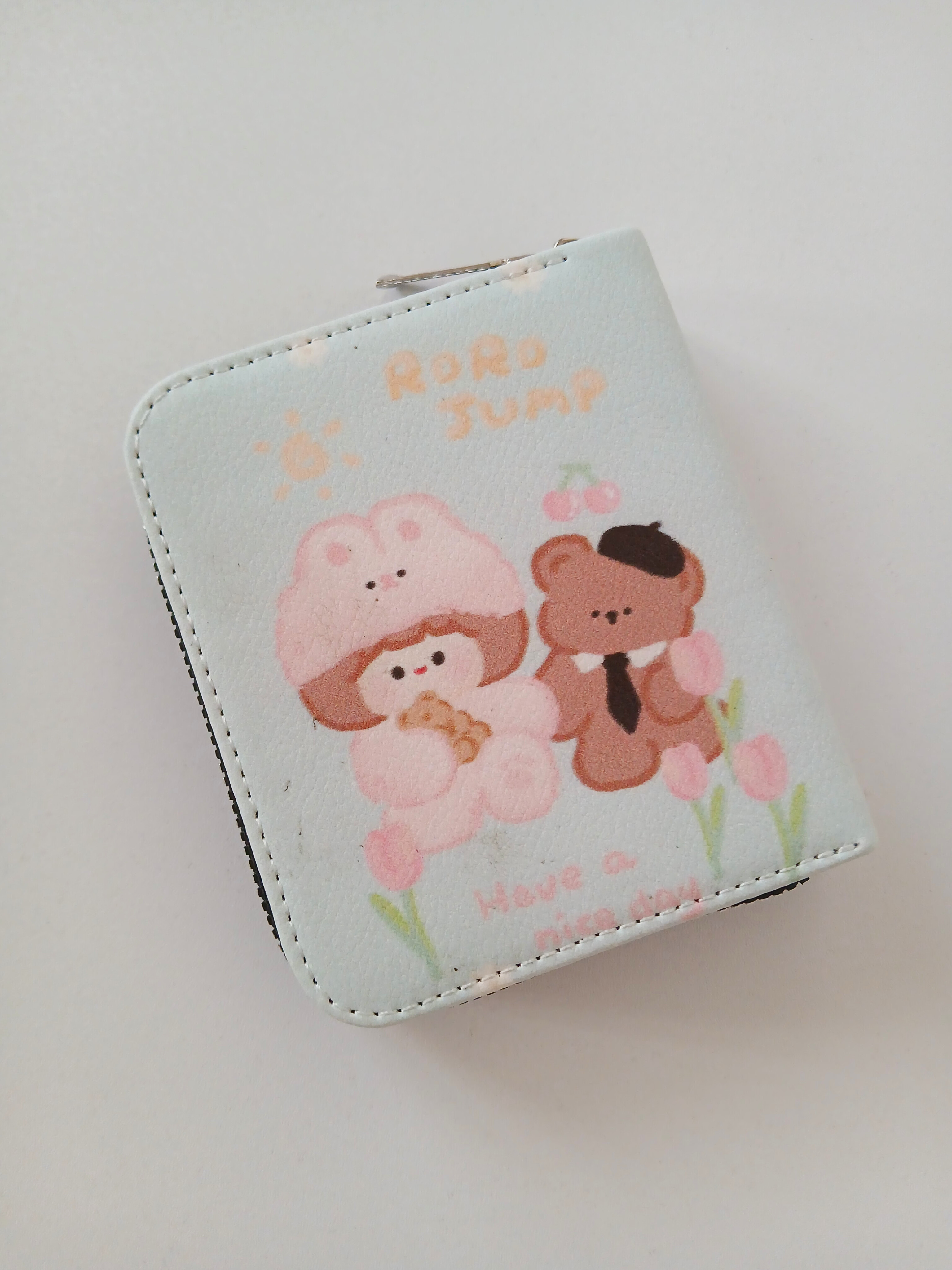 جنس چرم صنعتی چاپی یک سمت کیف کمی چاپش ایراد داره ابعاد ۱۱.۱۱.۳ دارای جای کارت و خرده ریز اسکناس بصورت یک تا جا میشه